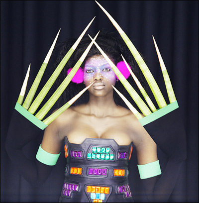 Set against a stark, hazy black background, the dreamlike characters in these images appear to evoke haunted forests, chrome spaceships, traveling circus shows, and early ’90s NYC club culture. In almost every image, you can find a spray of brightly-colored wildflowers decorating the otherwise synthetic-looking subject, recalling these images of the Surma and Mursi tribes of East Africa by Hans Sylvester. Many more images, after the jump.